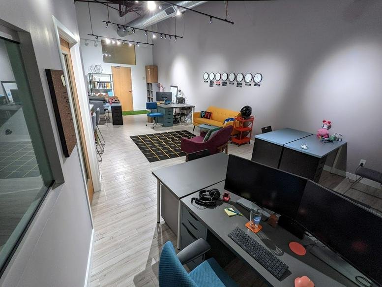This workspace truly shines with a fully-equipped meeting room boasting video-conferencing technology, alongside a dedicated podcast audio recording space. A community lounge invites relaxation, featuring comfortable seating, a 4K media center, high-speed internet, PCs, and a snack-filled kitchenette for breaks between work.