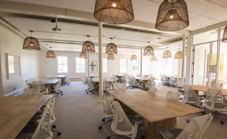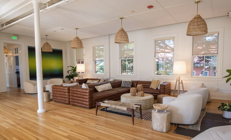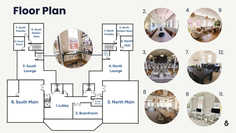 The location is highly convenient for international professionals, with the international airport just thirty minutes away by car. A brief stroll away is the Presidio Theatre Performing Arts center, providing an excellent option for team or client entertainment. Inside, the workspace is complemented by curated artwork and views of the Golden Gate Bridge.