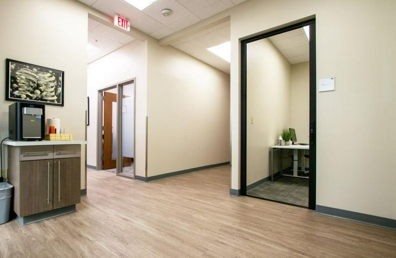 This High Point, NC office space is designed to support local entrepreneurs and professionals. The suite features a large meeting room with modular tables, accommodating up to 20 people in various configurations. The space also comprises 25 private offices, a coworking area with a bar-height table, three study carrels, and two cozy cubby chairs. Spanning 6762 square feet, the recently renovated space is conveniently situated on the first floor, right by the main entrance.