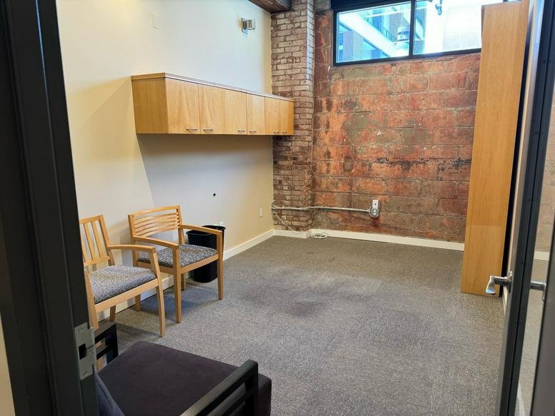 Situated on the first floor of a characterful loft building in Montclair, NJ, this office space offers a blend of historic charm and modern functionality. The suite features two workstations with ergonomic furniture, complemented by two offices boasting exposed brick walls, high ceilings and glass doors. Tenants benefit from exclusive use of a 12-person conference room, complete with cathedral ceiling and oak beams, as well as a kitchenette, bathroom and generous storage facilities.