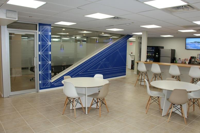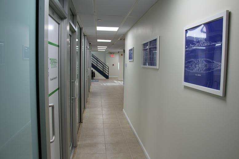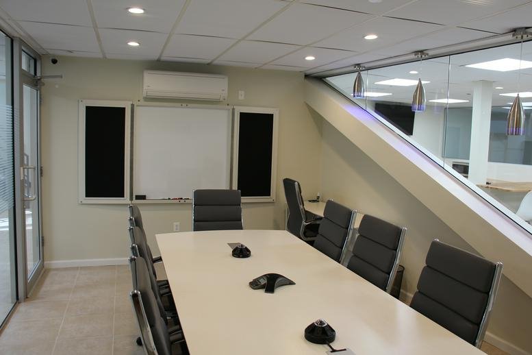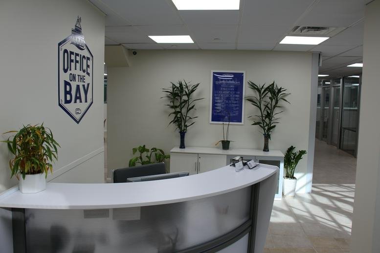 Office on the Bay offers a mix of private and shared coworking spaces in Suite 105, featuring dedicated meeting rooms and professional video conferencing facilities. The interior is configured for versatility, accommodating both collaborative team projects and quiet individual tasks.