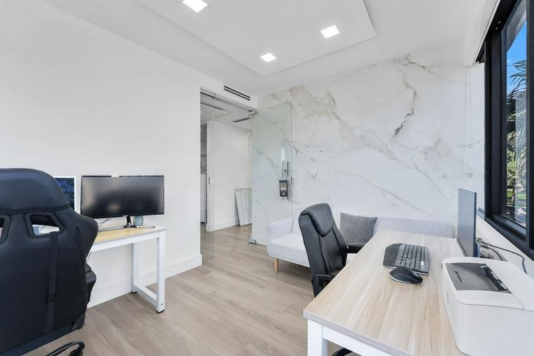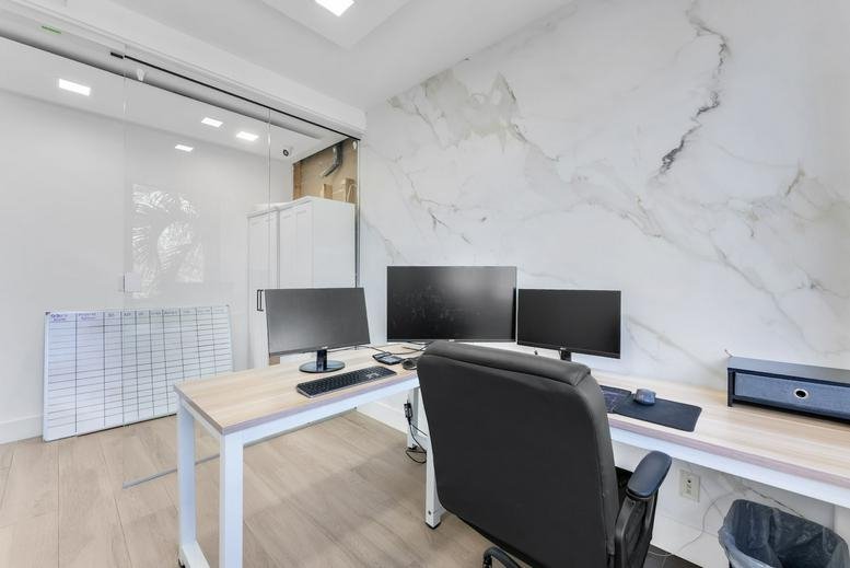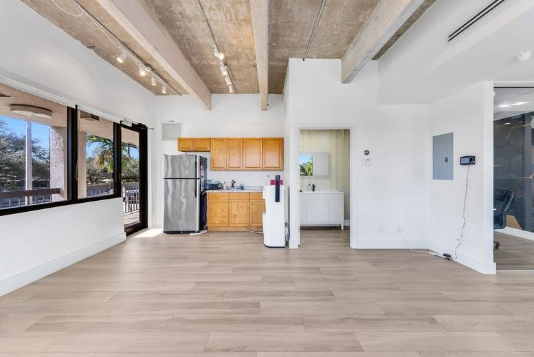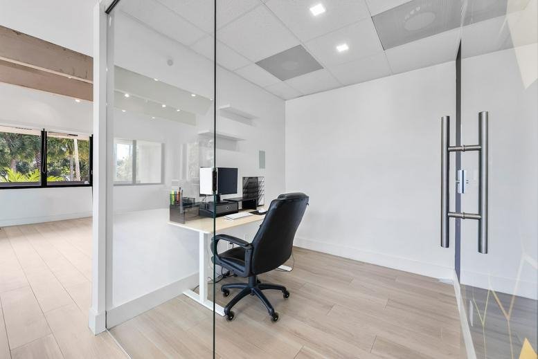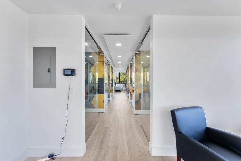 This Hollywood workspace occupies a private corner unit on the second floor of a two-story building, providing a professional environment with elevator access. The office features impact-resistant windows for effective sound insulation, creating a quiet and focused setting. A shared kitchen is available for light refreshments, helping to minimize disruptions and keep teams refreshed throughout the workday. Ample on-site parking is provided, including an electric vehicle charging station.
