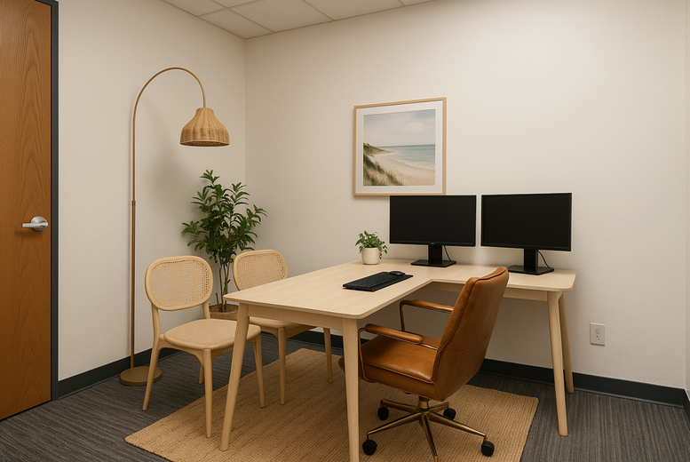 This professional workspace provides a versatile environment for teams seeking a turnkey solution in Suite 100. The layout includes dedicated desks, flexible seating options, and quiet private areas designed for focused tasks. High-speed Wi-Fi runs throughout the building, while bookable meeting rooms and comfortable common areas offer spaces for collaboration and team sessions.