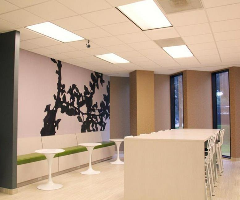 This office design emphasises natural illumination and incorporates a landscaped garden. On-site amenities comprise a multi-storey car park with a covered walkway to the entrance, alongside a shared kitchenette. Security is ensured through 24-hour surveillance, on-site patrols, and controlled access systems.